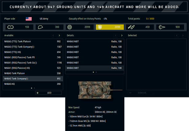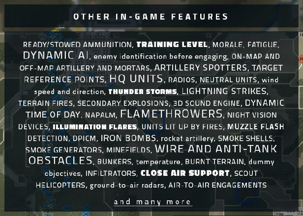 Gerçek arazi üzerine modellenen büyük haritalar, her savaşı gerçek bir zeka testi haline getirir. Hava durumu ve görünürlük bir rol oynar ve havadan havaya savaş ve topçu dahil çeşitli mühimmat türleri ile hiçbir savaş aynı olmayacak. Heyecan verici ve zorlu tank savaşı yalnızca gerçekçilik seviyesine katkıda bulunur.