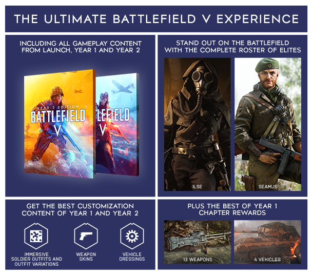 İşte karşınızda en üst düzey Battlefield™ V deneyimi. En başından itibaren açılan tüm oynanış içerikleriyle karada, havada ve denizde insanlık tarihinin en büyük çatışmasına girin. Silahlar, taşıtlar ve cihazlardan oluşan eksiksiz cephanelikten seçim yapın ve kendinizi 2. Dünya Savaşı’ndaki çetin savaşlara katılmış gibi hissedin. Tam kadro Elit Askerler ve 1. Yıl ve 2. Yılın en iyi özelleştirme içerikleriyle savaş alanında parlayın.