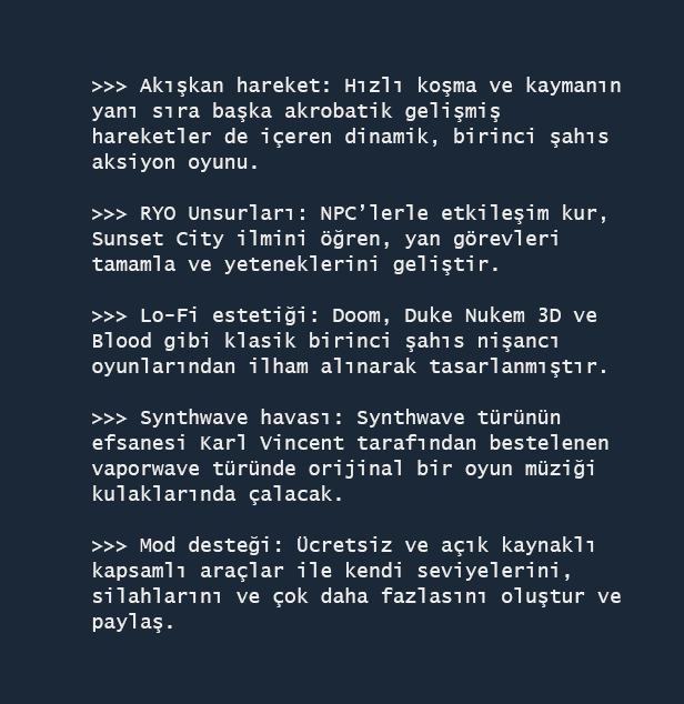 Yuri adlı gizemli bir kadın sana bir teklif sunuyor. Hatıralarını geri alabilirsin ama karşılığında güçlerini, suçun kol gezdiği, vebaya yakalanmış Sunset City’de bir sokak samurayı olmak için kullanman gerekiyor.