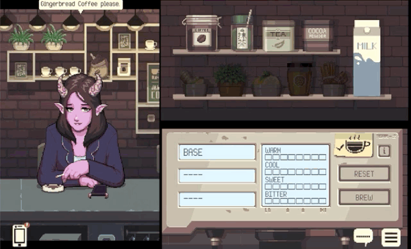 Coffee Talk , insanların sorunlarını dinlemek ve stokta bulunan malzemelerden sıcak bir içecek hazırlayarak onlara yardım etmekle ilgili bir oyundur. İnsanlardan daha fazlası olan bir oyuncu kadrosuna sahipken, hayatları olabildiğince insanca tasvir eden bir oyundur.