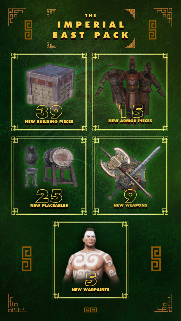 Conan Exiles'taki yapılarınızı daha önce görülmüş her şeyden çok daha farklı gösterecek olan yepyeni bir Hitay bina parçaları setiyle harika saraylar veya kudretli kaleler inşa edin. Üç yeni zırh ve bir yeni silah setiyle savaşmaya hazırlanın. Kazanlar, kilimler, masalar ve mangallar gibi pek çok yeni taşınabilir eşya ile evinizi süsleyin ve yeni savaş boyalarıyla görünümünüzü özelleştirin.