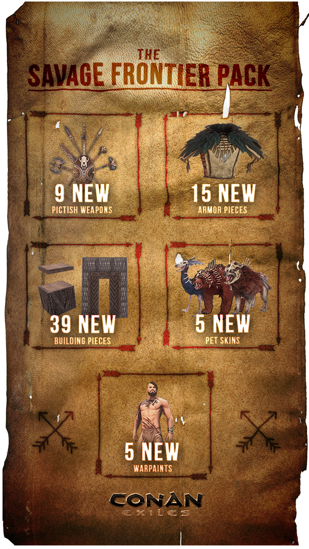 Yerleşimlerinizi ve kalelerinizi, Aquilonia‘nın öncü topraklarındaki amansız Pict yağmacılarını püskürtmek üzere yapılmış yeni Frontier yapı parçaları setiyle inşa edin. Kendinizi Pictish Wizard zırhı gibi yepyeni Pictish zırh setleriyle donatın. Mistik rûnlerle, vahşi hayvanların deri ve kafataslarıyla süslenmiş yeni bir Pictish silah seti üretin. Yeni pet sisteminde evcilleştirilen hayvanların görünüşünü değiştirmek için kullanılabilen beş özel evcil hayvan derisi edinin ve vücudunuzu yeni, şık savaş boyalarıyla süsleyin.