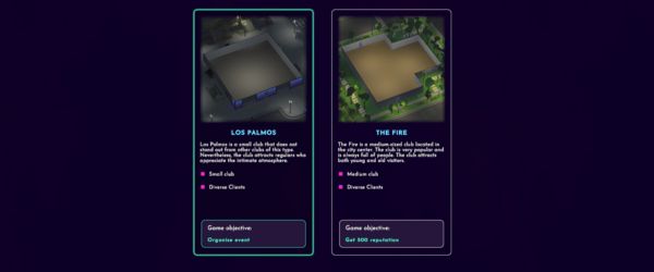 Oyunun başında menajerini seçebileceksin. Her birinin kulübün farklı yönlerini yönetmek için kendine özgü becerileri vardır. Kulübünü hangi şekilde geliştirmek istediğine karar ver. Seçtiğin yöneticinin becerileri oyunun ilerleyen aşamalarında meyvelerini verecektir. Örneğin: barmenler için bonus, konserler düzenlemek veya müşterileri mutlu etmek. Seçim senin!