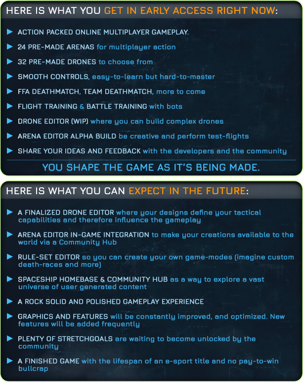 DRONE, özünde çok oyunculu bir arena nişancı oyunudur. Oyun, muhteşem bilim arenalarında hızlı tempolu hava muharebesi etrafında şekillenmiştir. Ama bekleyin, dahası var: Oyun tarzınıza uyan karmaşık uzaktan kumandalı savaş araçları oluşturun ve yönetin. Gizli vuruş ve koşma stratejileri için en küçük boşluklara uyan minik dronlardan, yıkıcı ateş gücüne sahip tank gibi dev canavarlara kadar her şey mümkündür. Ne yaratmak ve nasıl oynamak istediğiniz size kalmış! Erken erişim sırasında olasılıklar sık sık artacaktır, örneğin kara tabanlı araçlar yol haritamızdadır.