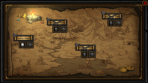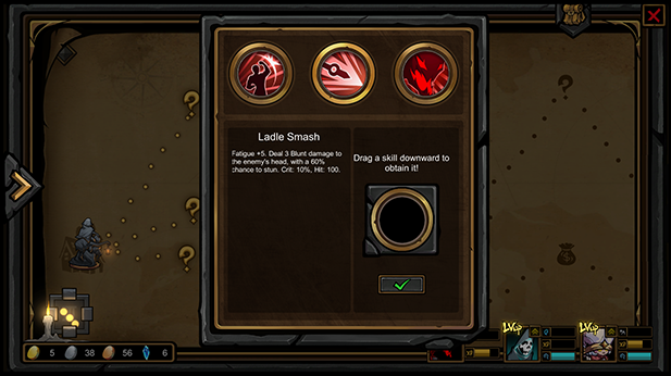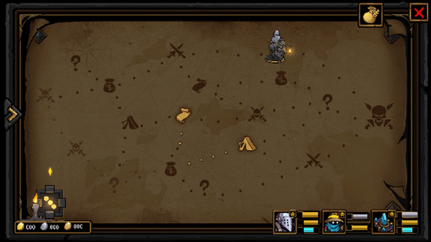 Keşif gezileri sırasında karakterler rastgele olaylar, savaşlar, dinlenme alanları, mağazalar vb. İçeren 'odalara' girer. Oda konumları ve rotaları her keşif seferinde rastgele oluşturulur, böylece her biri yeni bir şeyler sağlar. Hangi odaya gideceğinize zar atmanız karar verirken, siz yolda bir çatala vardığınızda hangi yöne gideceğinize aktif olarak karar verirsiniz.