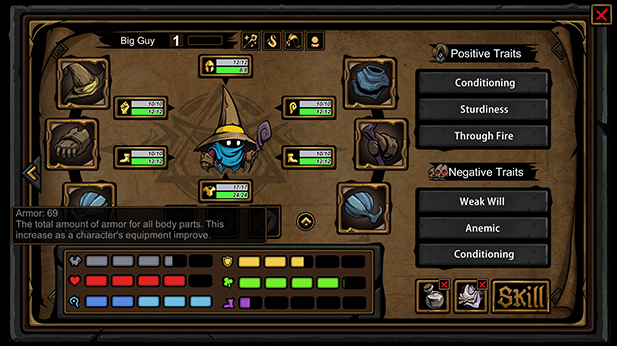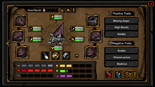 Örneğin: Eğer uzuvları (yani kolları veya bacakları) savaşta koparsa, uzvu kullanan hiçbir beceri artık kullanılamaz. Ve bir maceracının zırhı yok edilirse, çıplak bırakılır (her eyaletin kendi ilgili sanat varlıkları vardır).