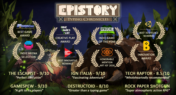 Epistory'de her şeyin anlatılmadığı bir dünyada kurgusal bir karakter olan ilham perisini oynuyorsunuz. Maceranız boş bir sayfada başlıyor, ancak siz ilham topladıkça , gizemlerini çözdükçe ve düşmanlarını yendikçe dünya yakında büyüyecek ve daha canlı olacak. Hareket etmekten sandıkları açmaya ve destansı savaşlarda savaşmaya kadar, oyundaki her öğe yalnızca klavye ile kontrol ediliyor.