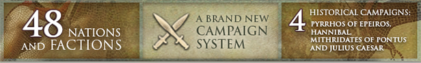 - Özel Savaş sistemi, bilgisayar tarafından oluşturulan gerçekçi arazi haritalarında, dikkatlice araştırılmış ordu listelerinden tarihsel olarak gerçekçi orduları kullanarak sınırsız "ne olur" senaryosuna izin verir. Kapsanan ordular arasında Romalılar, Kartacalılar, Helenistik Krallıklar (Makedon, Seleukoslar, Ptolemaik Mısır vb.), Galyalılar, Eski Britonlar, Galatlar, İspanyollar, Numidyalılar, Spartaküs'ün Köle İsyanı, Trakyalılar, Skythians, Sarmatyalılar, Partlar, Kızılderililer ve çok daha fazlası bulunmaktadır.