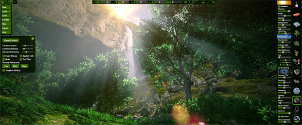 Manzaranız için yirmi dört 4k dokudan oluşan bir kombinasyon kullanabilir ve ardından yirmi dört farklı gökyüzü arasından seçim yapabilirsiniz. Kamera ayarlarında, son görüntünüz üzerinde çok fazla kontrole sahip olmanızı sağlayan çok sayıda kaydırıcı vardır.