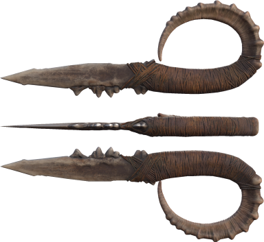 Koç boynuzu ve kurt çenesi. Bu Muştalı Bıçak, hem av hem de avcı tarafından kullanılabilinen bir alettir. Av ve avcının ortak özelliği, hayatta kalma ihtimallerini tehdit eden her türlü yaratığa pençelerini ve dişlerini geçirme içgüdüsüdür.