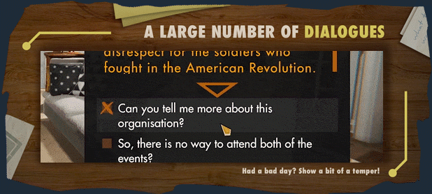 Anlatımı takip edin ve olaylara tepki gösterin . Danışmanlarınızla konuşun, ziyaretçileri kabul edin ve kararlar verin. Yanlış cevap yok... olmadıkça? Kendinizi kontrol edin ve başarısız olursanız oyunu tekrarlayın - yeni diyaloglar keşfinizi bekliyor, bu yüzden tekrarlama konusunda endişelenmeyin. Ne de olsa Amerika bir günde kurulmadı.