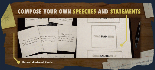 Yazma becerilerinizle insanların kalplerine dokunun. Hedeflerinize ulaşmak için en çekici konuşmaları ve ifadeleri oluşturun. Öfkeli grevcileri sakinleştirmek ister misiniz? Partiye en verimli başkan olduğunu mu göstereceksin? Devlet cenazesinde herkesin moralini yükseltmek mi? Bunların hepsi uygun bir kompozisyon ile yapılabilir. Gelmiş geçmiş en karizmatik lider unvanını alın!...