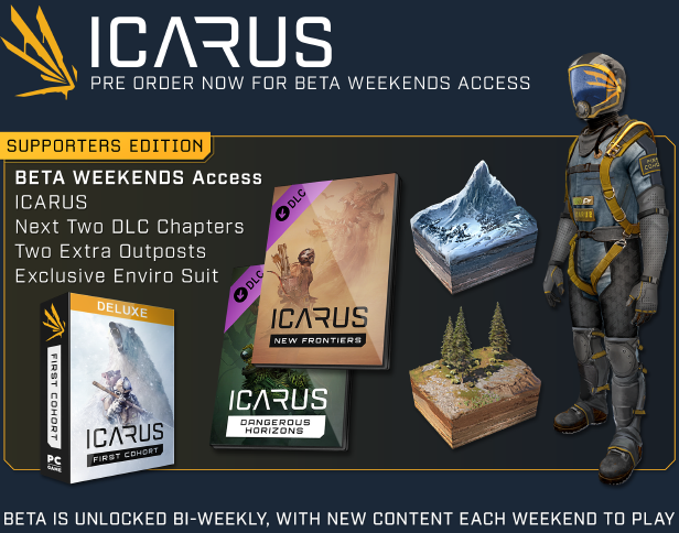 ICARUS: Supporters Edition, gelecek yıllar boyunca Icarus evreninin önemli bir parçası olmanızı sağlayan nihai pakettir. Yüzeyin hemen altında egzotik maddelerle zengin, başarısız bir terraforming projesi olan Icarus'ta servet arayan maden arayıcılarına katılın. Yeni bir çağ altın hücumu patlarken, gezegene inin, karakterlerinizi büyütün, görevleri tamamlayın ve pencereniz kapanmadan yörüngeye dönün. ICARUS: Supporters Edition, Icarus: First Cohort'un yanı sıra, 2022 için planlanan iki DLC genişletmesi, ICARUS: New Frontiers ve ICARUS: Dangerous Horizons'ı içeriyor.