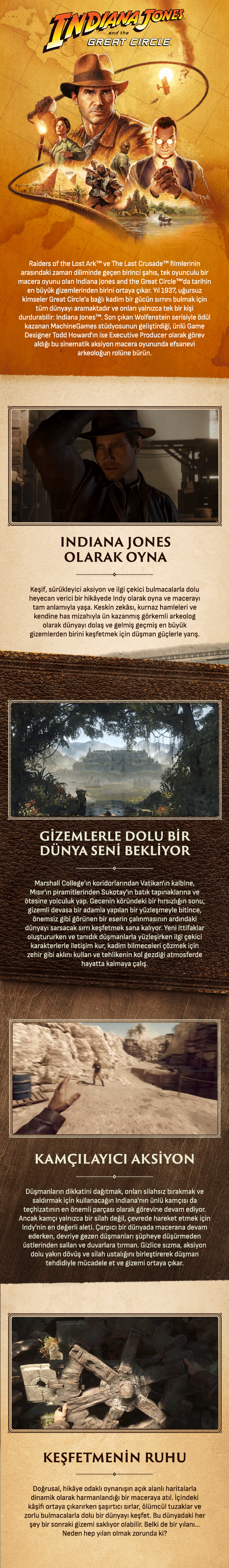 Raiders of the Lost Ark™ ve The Last Crusade™ filmlerinin arasındaki zaman diliminde geçen birinci şahıs, tek oyunculu bir macera oyunu olan Indiana Jones and the Great Circle™'da tarihin en büyük gizemlerinden birini ortaya çıkar. Yıl 1937, uğursuz kimseler Great Circle'a bağlı kadim bir gücün sırrını bulmak için tüm dünyayı aramaktadır ve onları yalnızca tek bir kişi durdurabilir: Indiana Jones™. Son çıkan Wolfenstein serisiyle ödül kazanan MachineGames stüdyosunun geliştirdiği, ünlü Game Designer Todd Howard'ın ise Executive Producer olarak görev aldığı bu sinematik aksiyon macera oyununda efsanevi arkeoloğun rolüne bürün.
