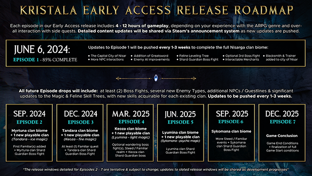 Kristala artık Erken Erişimde ve ayrı Bölümler halinde yayınlanacak. 1. Gün satın alımınız, geliştirildikleri ve yayınlandıkları şekliyle 7 Bölümün tümüne tek seferlik indirimli fiyatla erişimin kilidini açar.