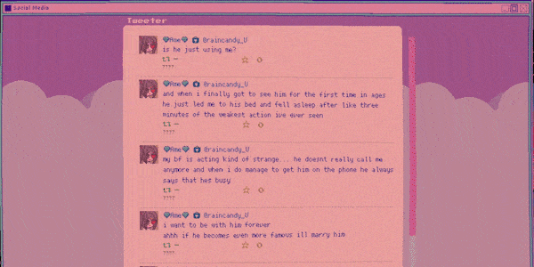 Ame-chan'ın sizin hakkınızda konuşmak için hem genel hem de özel hesapları kullanacağı sosyal medya aracılığıyla günlük eylem ve davranışlarınızın sonuçlarını görebilirsiniz. İnsanlar, özel olarak bir sürü boş konuşma ve dedikodu yayarken, dışarıdan destekleyici ve arkadaş canlısı davranma eğilimindedir.