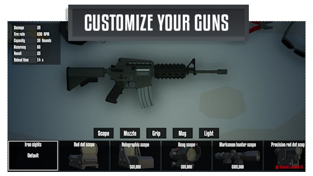 Oyun tarzınıza uyacak şekilde özelleştirilebilen yeni silahların kilidini açın ve satın alın. Eğer gizlenmeye çalışıyorsanız, en iyi seçim bir susturucu olabilir, ancak gürültü yapıyorsanız, önemli olan tek şey hasar ve mermilerdir, o yüzden uzatılmış şarjörü takın ve yola çıkın!
