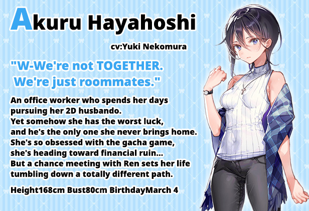 Akuru Hayahoshi, takıntılı olduğu gacha oyununda, ne kadar para atarsa atsın kocasını çekemeyen şanssız bir otaku ofis çalışanıdır.