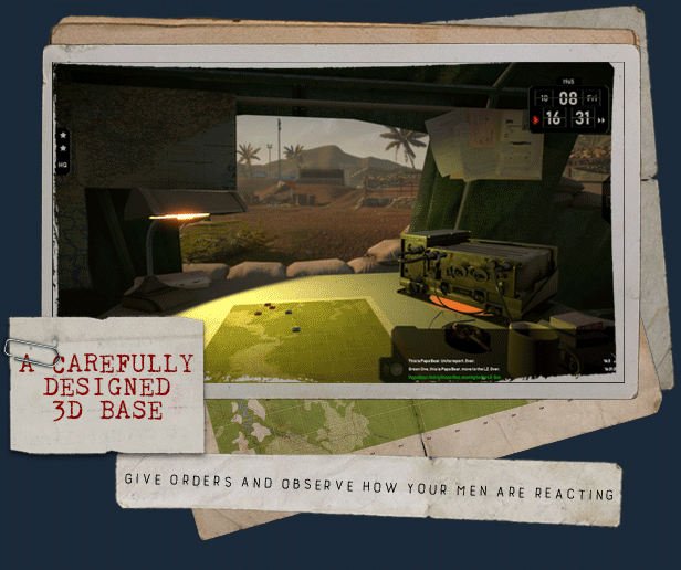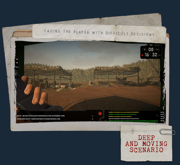 Gözlerinizden gizlenmiş anlatı katmanının altında derin ve karmaşık bir simülasyon gerçekleşiyor. Radio Commander'da her birim benzersiz istatistiklerle tanımlanır. Takımlarınızın morali, malzemeleri ve hatta dayanıklılığı hakkında endişelenmeniz gerekecek. Askerlerinizin düşmanla, düşmanca araziyle ve aşırı Vietnam iklimi ile karşılaşması sırasında tüm bu faktörler önemli olacaktır. Helikopterlerin yakıtlarının bittiğini ve ormanın ortasına inmeye zorlandıklarını bildirdiğinde ne yapacaksın? Kurtarma görevini daha fazla askerin hayatını riske atacak mısınız?