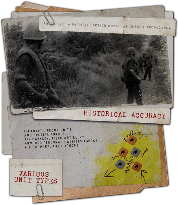 - 15 birim türü: piyade, tahliye helikopterleri, savaş gemileri, tarla topçuları, havadan keşif, M113 zırhlı personel taşıyıcıları ve napalm taşıyan F4 Hayalet jetleri (her birim benzersiz bir istatistik seti ile tanımlanır ve komutanla farklı bir iletişim kurar) ses),