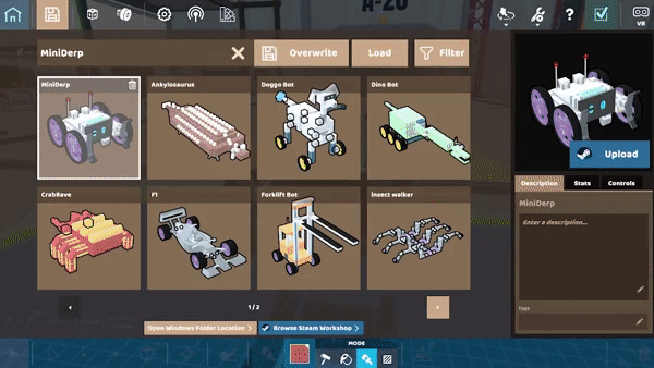 Steam'in yerleşik topluluk atölyesi özelliklerini kullanarak, başyapıtlarınızı diğer robotik dahileriyle paylaşabilir veya ilham almak ve yeniden karıştırmak için başkalarının robotlarını indirebilirsiniz!