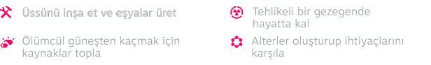 Hareketli üssünü yönetebilmek için gezegenin yüzeyini keşfedip metaller ve organik materyaller gibi değerli kaynakların peşine düşmen gerekiyor. Ancak bu güvenli üsten dışarı çıkmak seni ve alterlerini çeşitli ölümcül anomaliler ve güneşin radyasyonuyla karşı karşıya bırakıyor. Bu yüzden oyun içerisindeki gece ve gündüz döngüsüne dikkat edip günlük aktivitelerini akıllı bir şekilde planlaman şart!