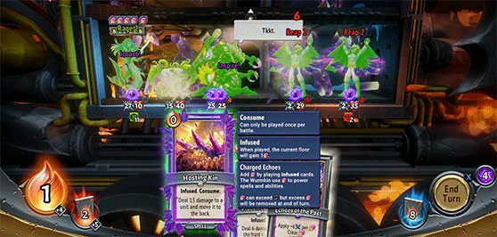 Cehennemin derinliklerinden yeni bir klan, 5 orijinal favorinizle güçlerini birleştirmek için yükseldi. Wurmkin Klanı, iki yeni güçlü şampiyon tarafından yönetiliyor. Spine Chief, hasar vermek ve yurttaşları daha da güçlü hale getirmek için Charged Echoes'un gücünü kullanır ve Echowright, tüketilebilir büyülerin gücünden yepyeni şekillerde faydalanabilir. Yüklü Yankılar, tüm zemin için güçlendirmeler yaratır ve Monster Train'in zaten çok çeşitli dünyasına tamamen yeni bir oyun mekaniği getirir.
