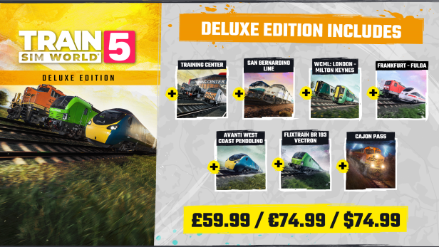 ÜCRETSİZ BAŞLANGIÇ PAKETİ sizi Eğitim Merkezi ile Train Sim World 5 ile tanıştırıyor, STANDART SÜRÜM 3 yeni rotayla geliyor, DELUXE SÜRÜM ayrıca ek yeni trenlerle geliyor ve ÖZEL SÜRÜM ek bir TSW5 Uyumlu rota setiyle geliyor.