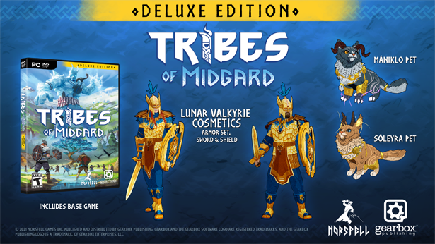 Tribes of Midgard Deluxe Edition; temel oyun, iki oyun içi evcil hayvan ve Ay Valkürü Kozmetik eşyalarından oluşan bir set içerir.