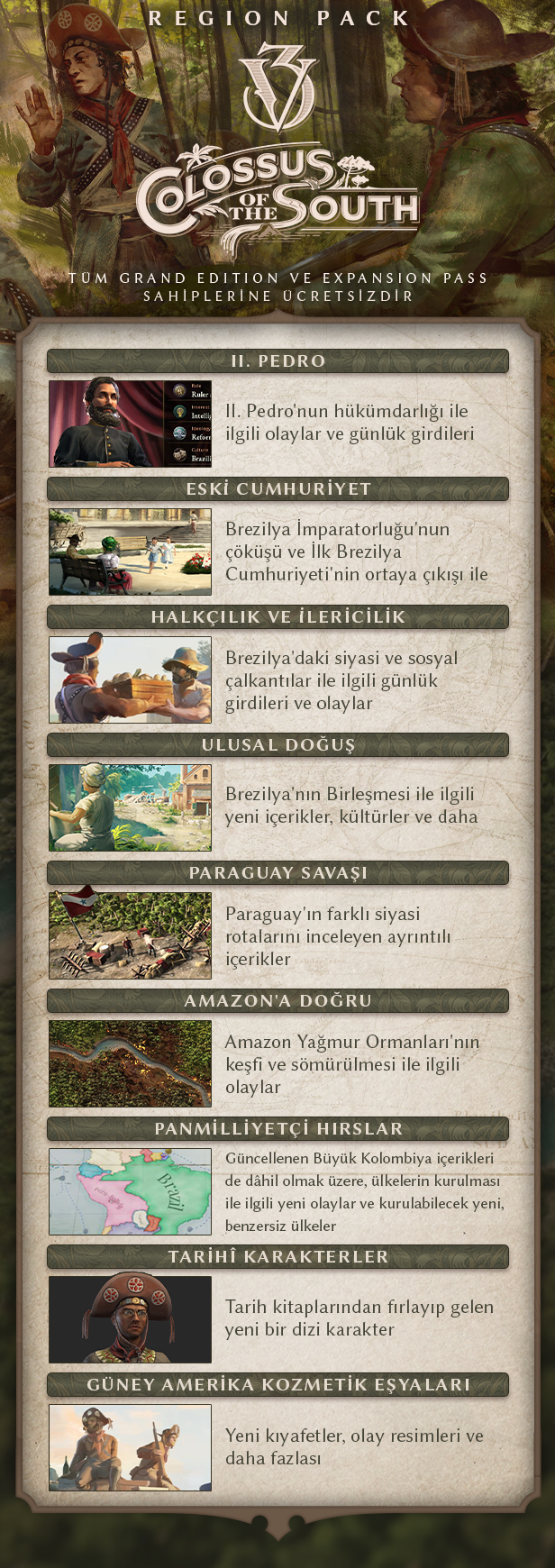 İnsan, kültür ve kaynak bakımından zengin olan Güney Amerika, Viktorya Dönemine pek çok avantajla giriyor. Ancak Avrupa himayesinden yeni kurtulmuş olan ulusları birçok zorluk bekliyor. Victoria 3 için yeni bir Bölge Paketi olan Colossus of the South'ta, Güney Yarım Küre'nin geleceğinde hak iddia et.