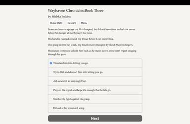 Wayhaven Chronicles: Üçüncü Kitap, seçimlerinizin hikayeyi kontrol ettiği, grafik veya ses efektleri içermeyen 1.200.000 kelimelik etkileşimli bir romandır.